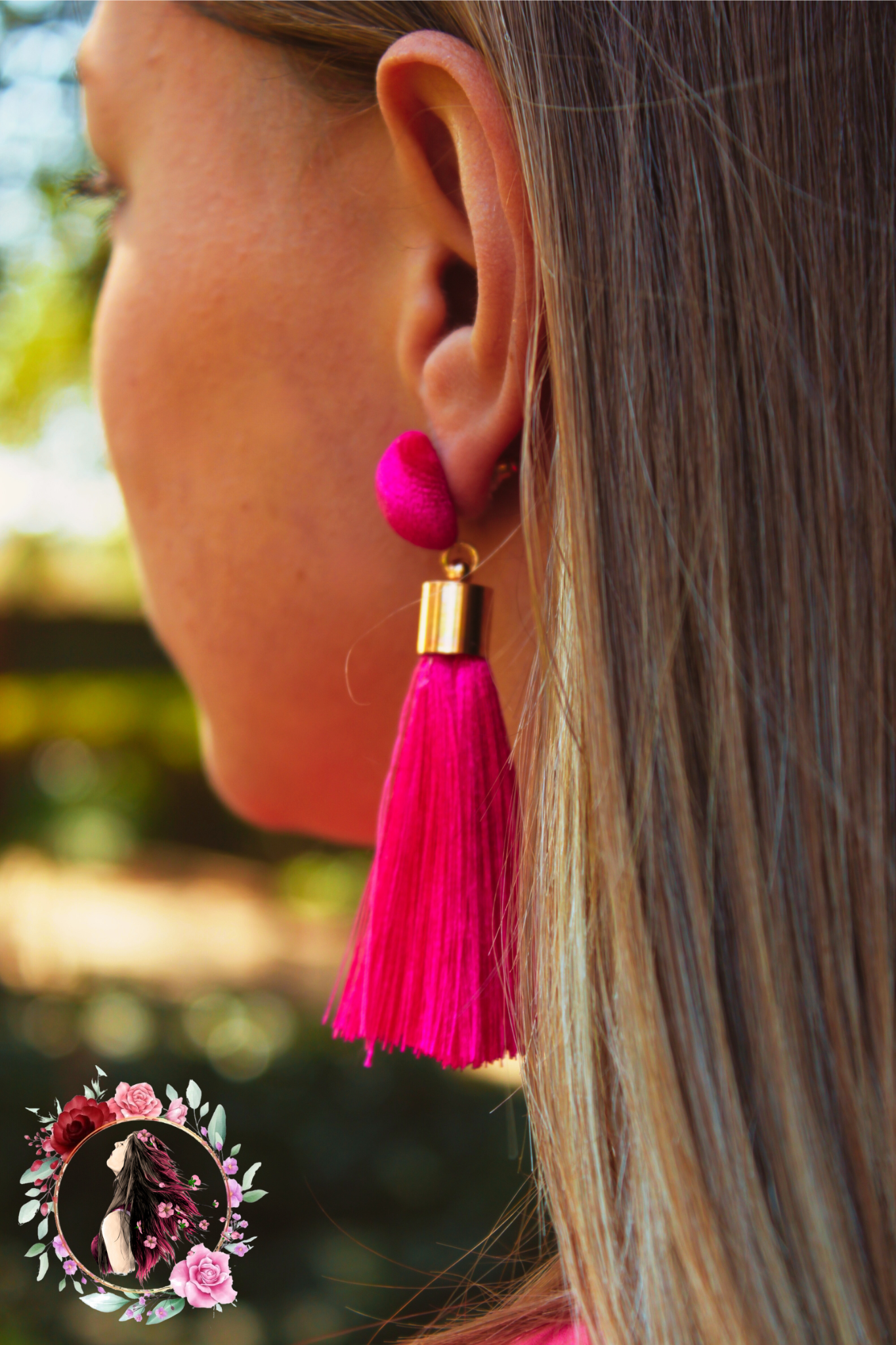 Why is it in fashion: Selected to match perfectly with the shirt and hand bag, these hot ping fringe earrings are absolutely great for a Spring day out.